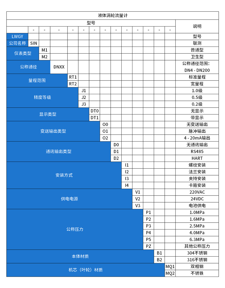 联测LWGY-SIN液体涡轮流量计是一种速度式仪表,它具有准确度高、重复性好、结构简单、压力损失小、维修方便等优点,用于测量封闭管道中低粘度液体的体积流量。